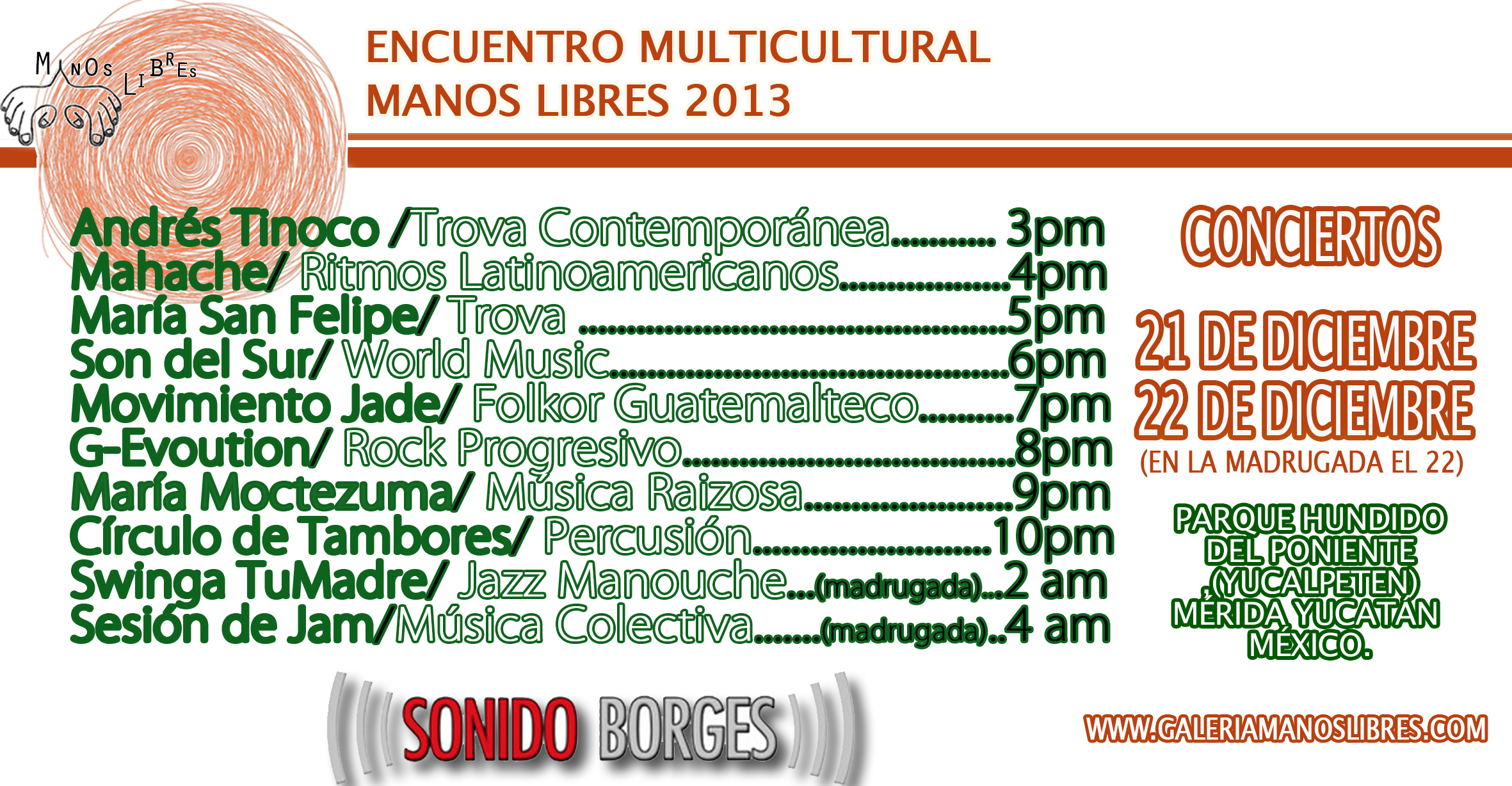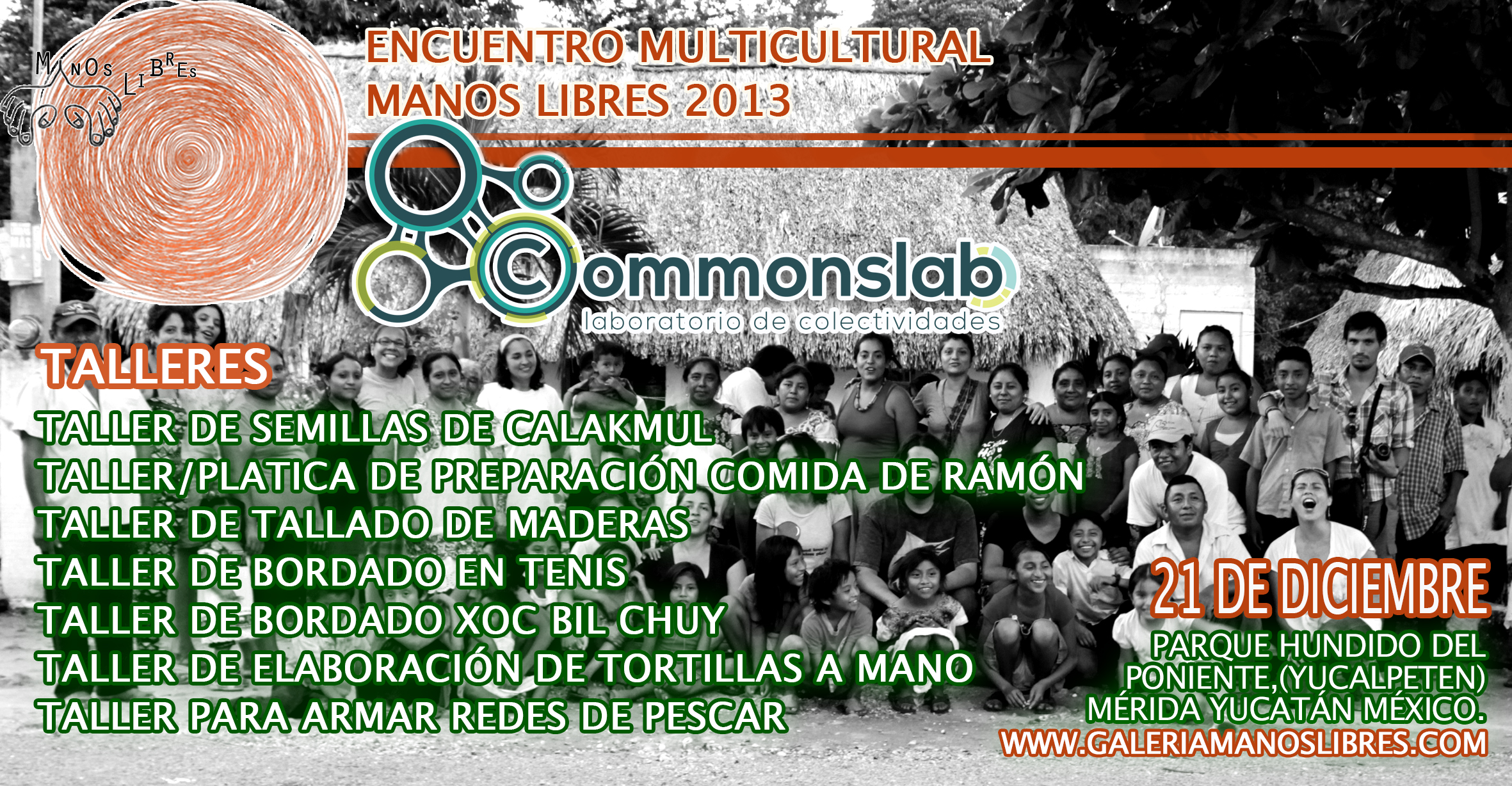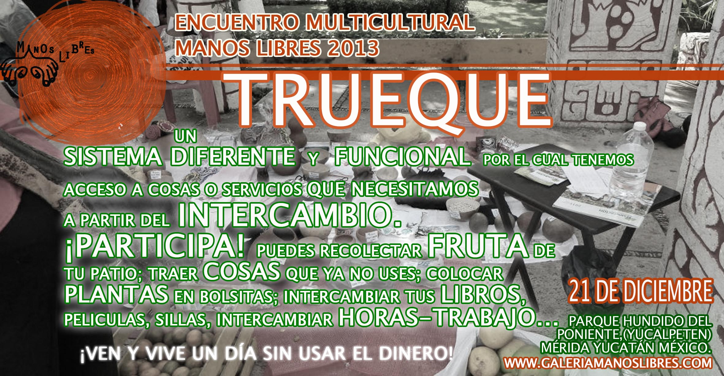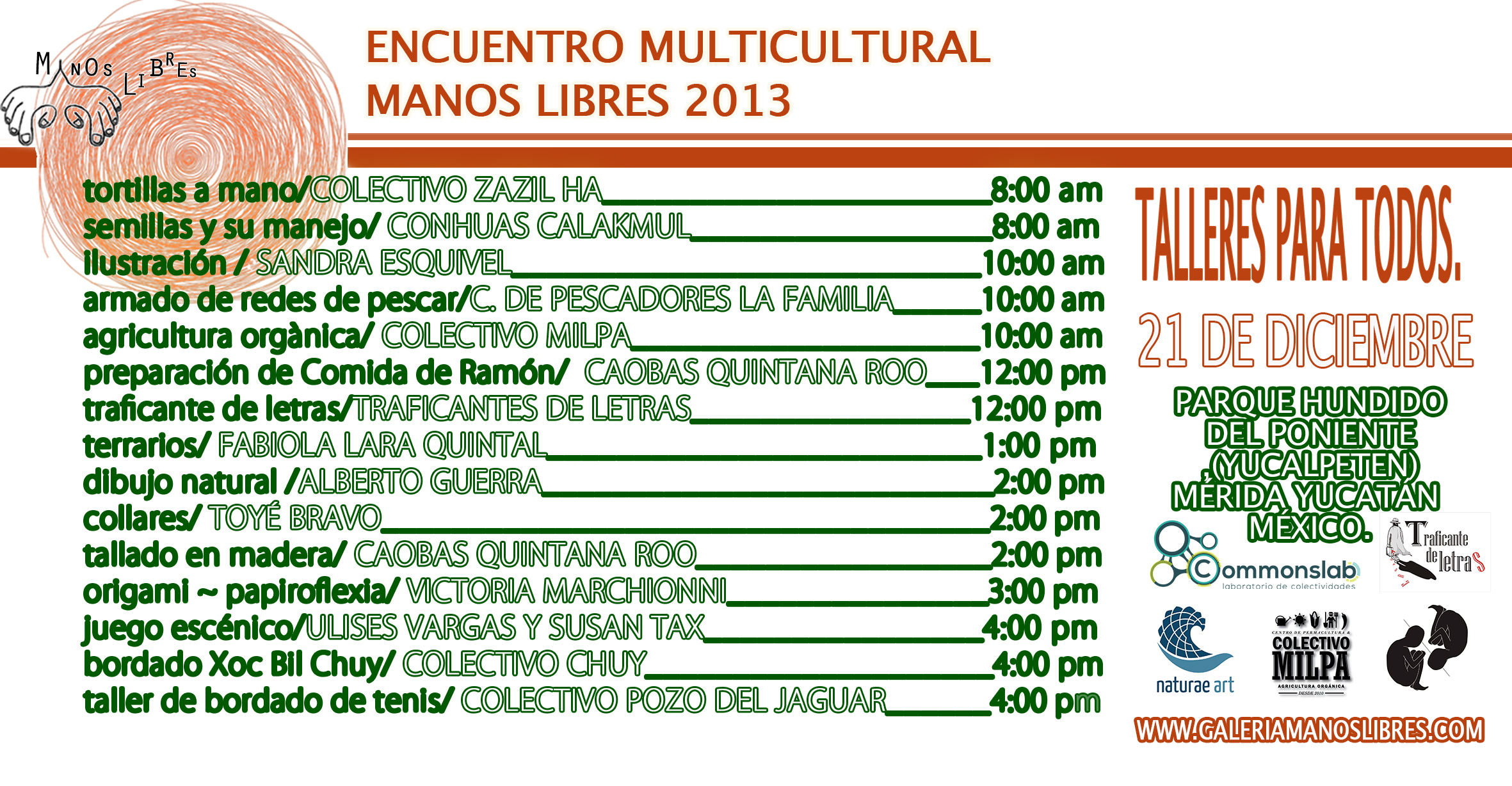 Encuentro Multicultural Manos Libres a celebrarse el día 21 de diciembre del presente año. Este es el 2º año que se realiza en la ciudad de Mérida, Yucatán, esta vez en el Parque Ecológico del Poniente, Yucalpetén.