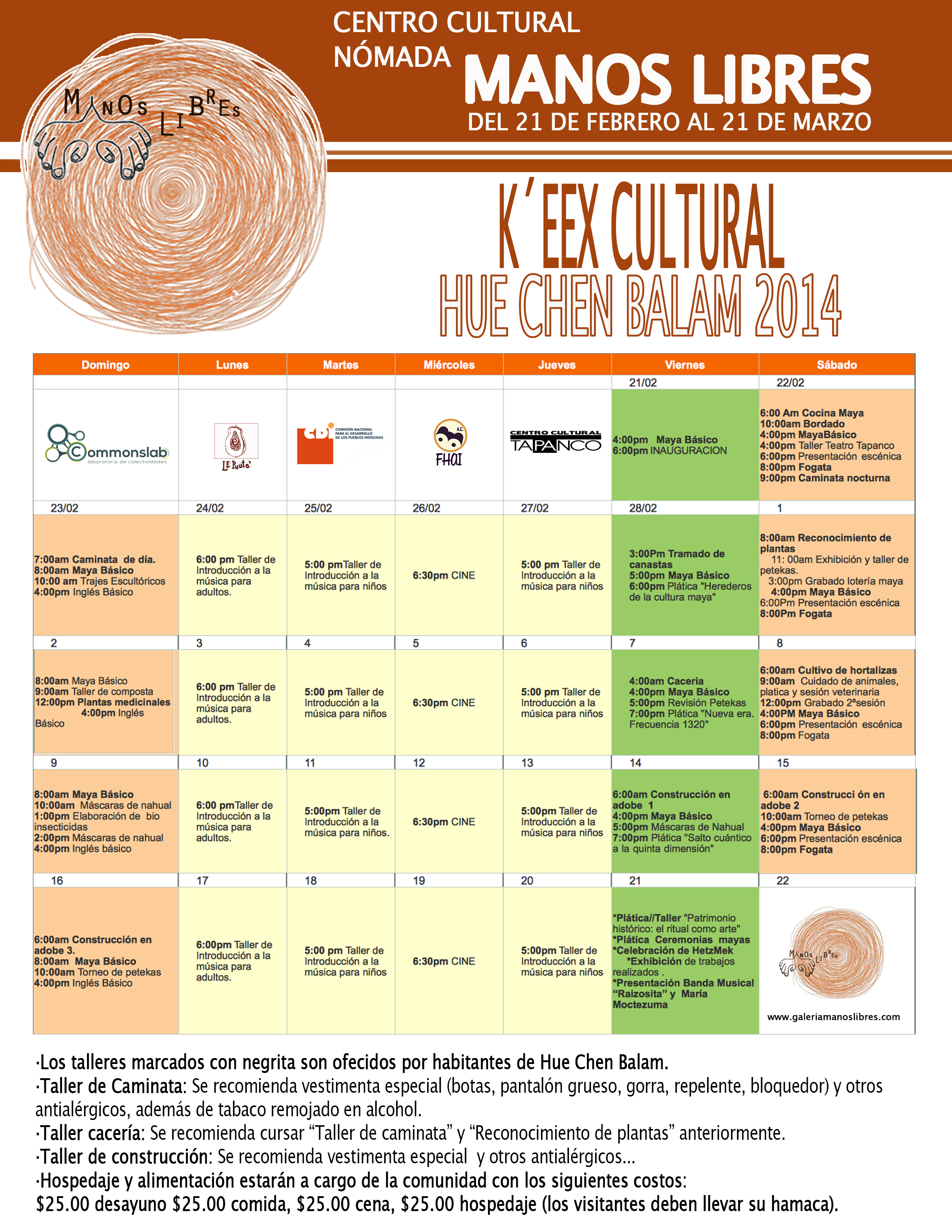 Para esta primer parte del proyecto K’eex Cultural se realizarán talleres gratuitos, impartidos tanto por miembros de la comunidad de Huechen Balam, así como también por la Asociación Manos Libres y sus colaboradores, combinado con presentaciones culturales y convivios.