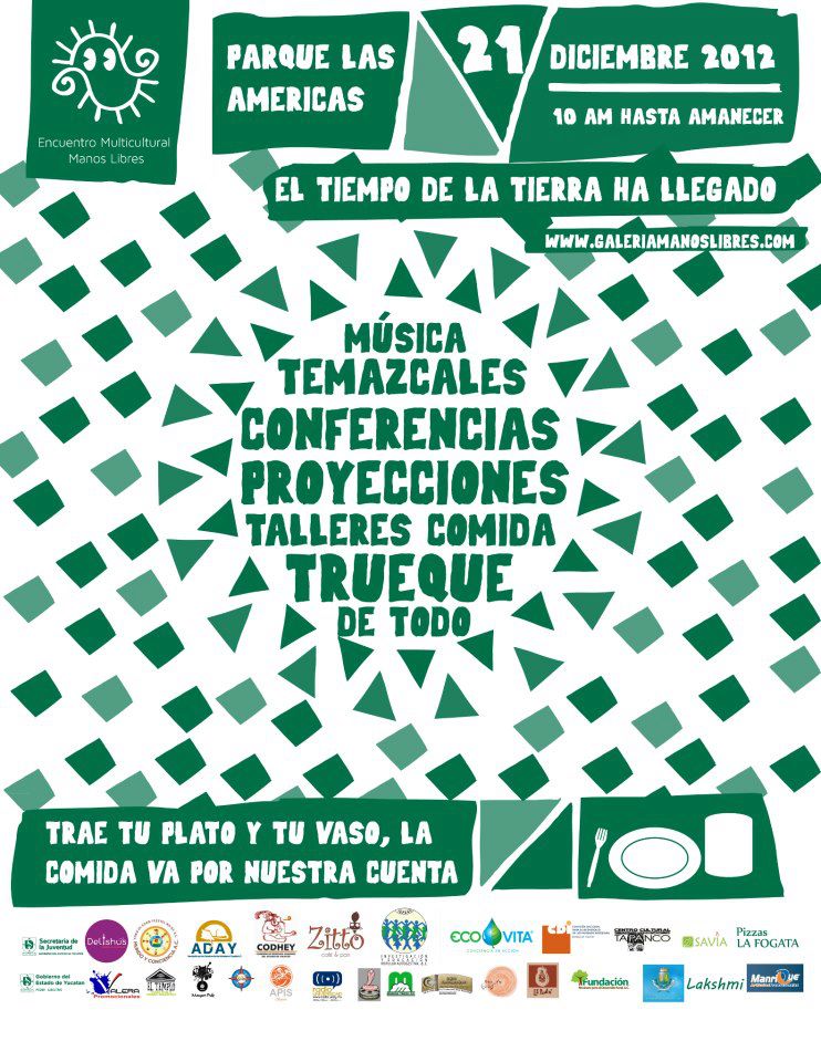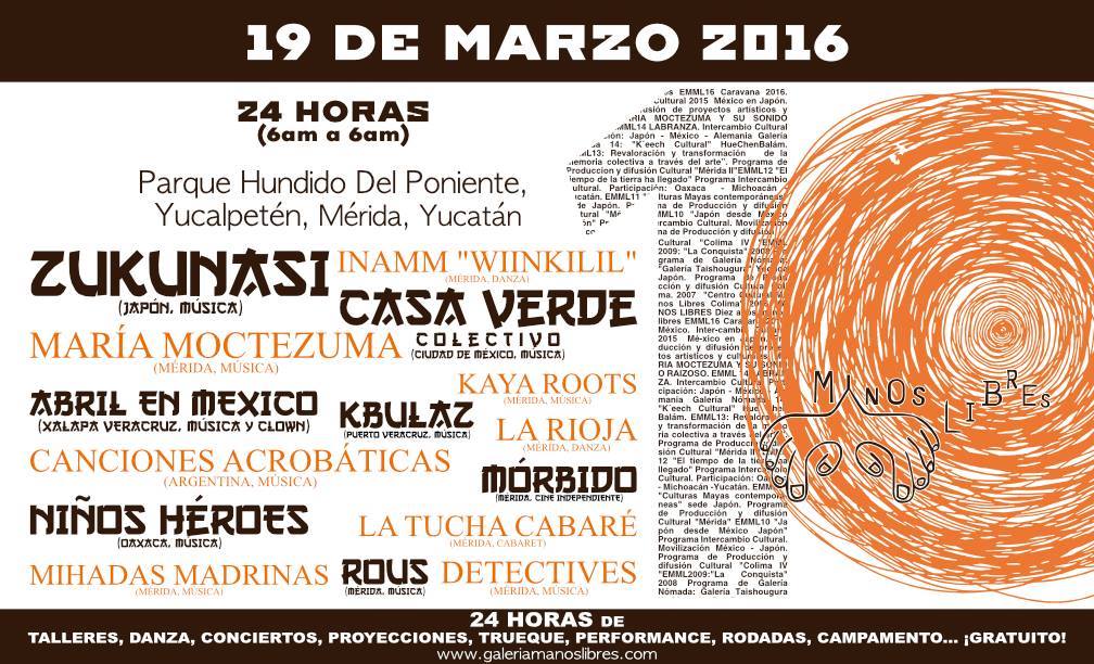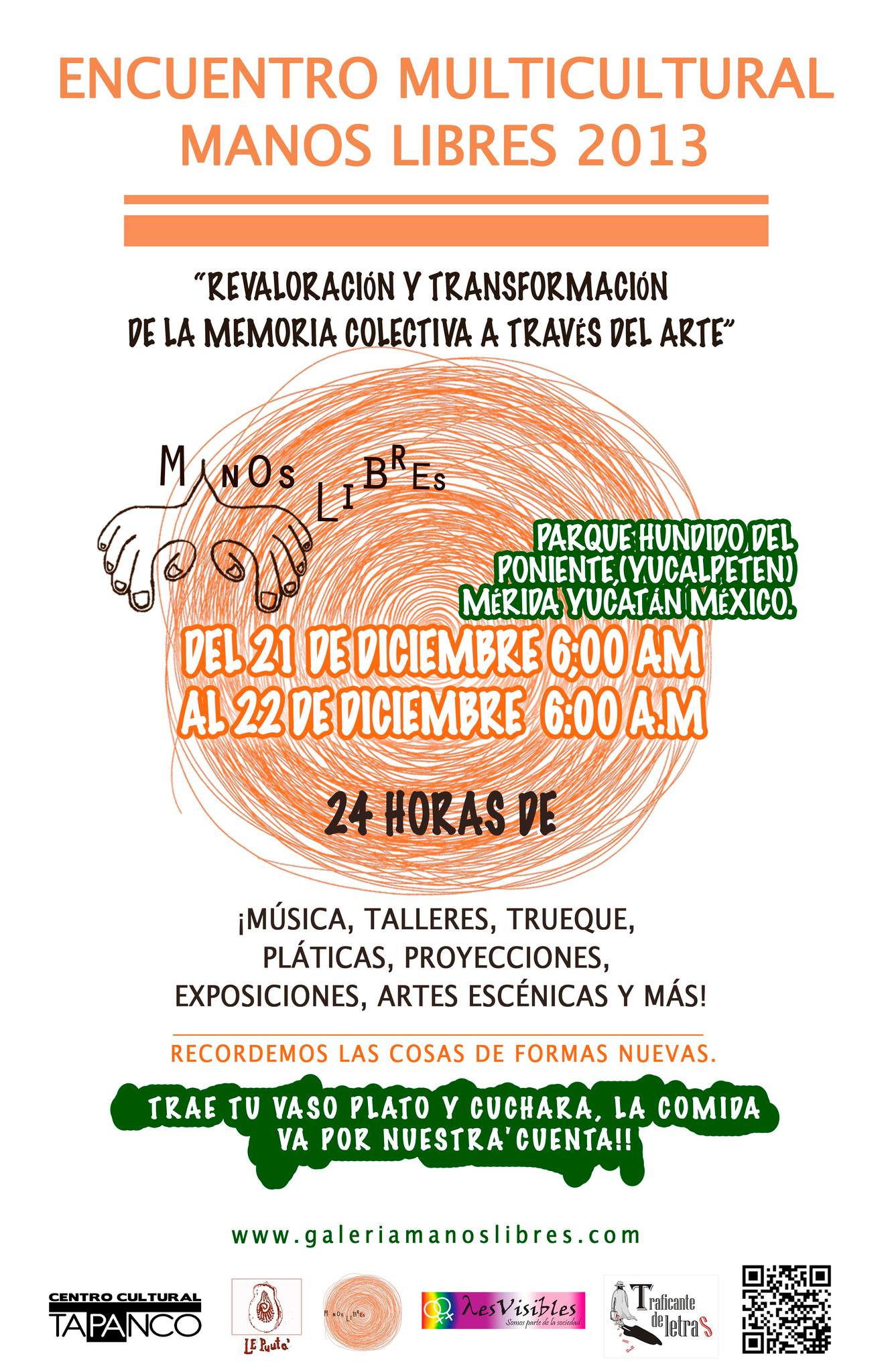 Tras la experiencia enriquecedora de compartir, crear y de hacer colectivo, nace el ENCUENTRO MULTICULTURAL MANOS LIBRES; un encuentro de creadores y artistas de distintas partes del mundo donde nos comparten sus formas de arte , técnicas y conocimientos, para realizarlo periódicamente lanzamos una convocatoria para reunir y respaldar el trabajo de artistas y proyectos en pro de la vida y libertad de expresión.